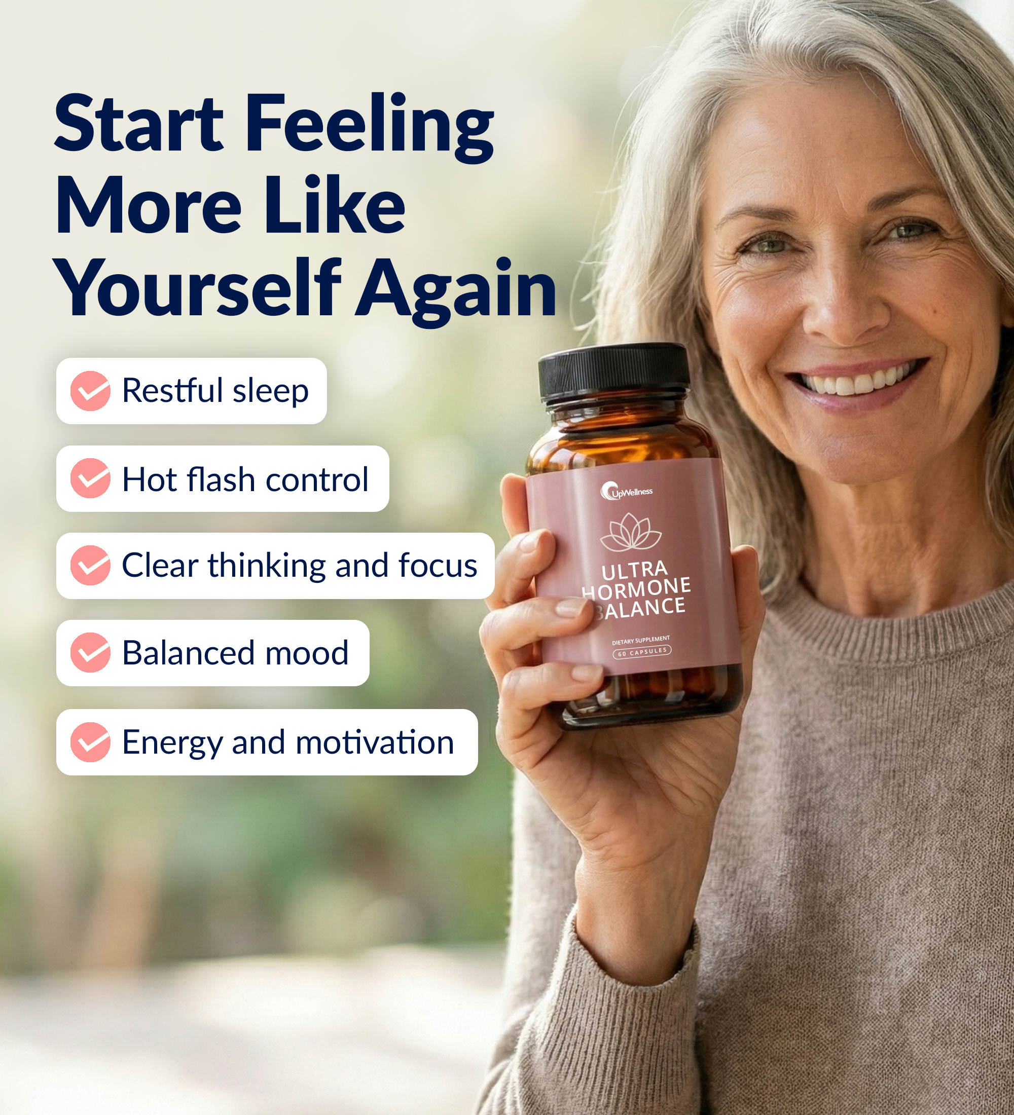 Try Ultra Hormone Balance risk-free for 60 days. If it doesn’t steady your hormones, lift your energy, and help you feel more balanced from the inside out, you don’t pay a dime.